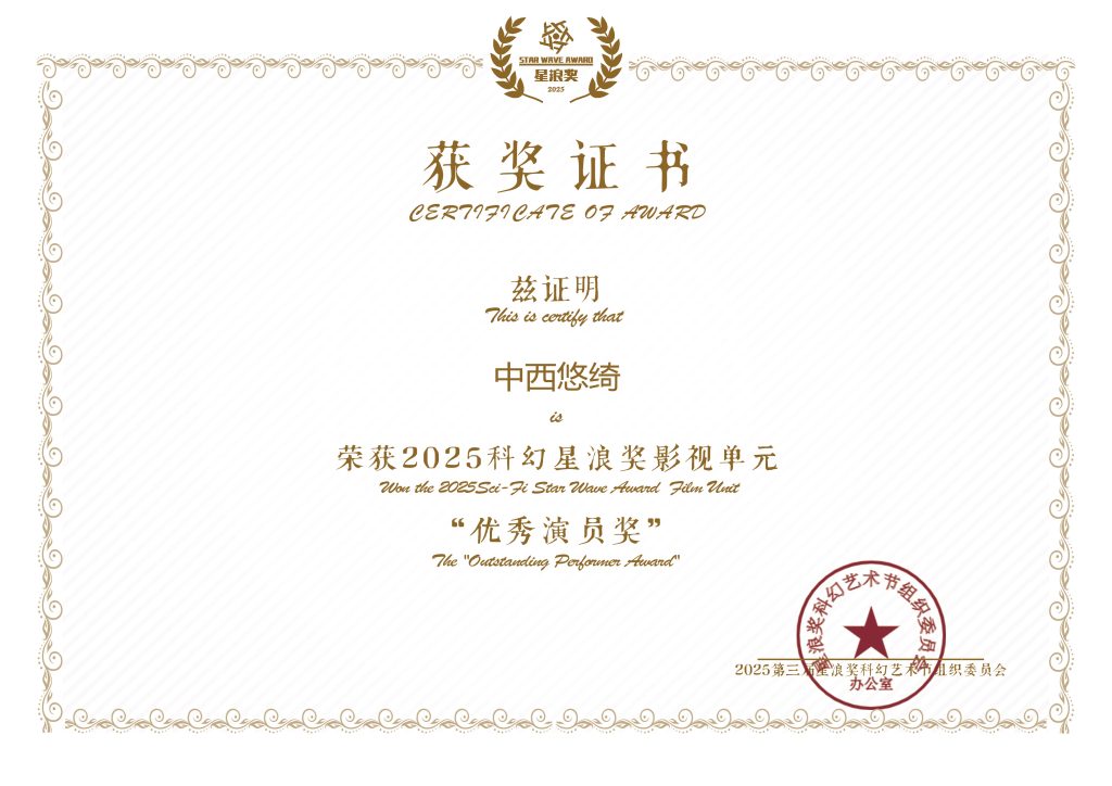 映画「TSUSHIMA」最優秀主演女優賞を受賞いたしました。 お知らせ2025-12-29 中国青島の第三届科幻星浪奖STAR WAVE AWARD2025にて、映画「TSUSHIMA」で最優秀主演女優賞を受賞いたしました。