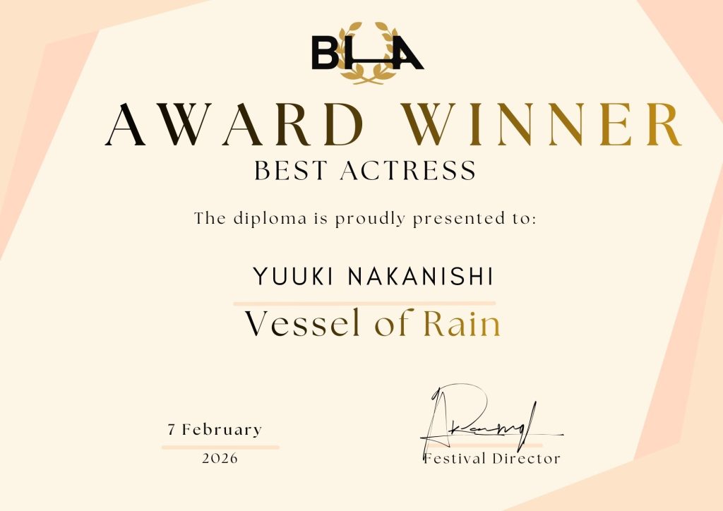 スペインの国際映画祭にて、映画「雨の器」で最優秀主演女優賞を受賞! お知らせ2026-02-12 スペイン・バルセロナで開催された国際映画祭にて、 映画「雨の器」で最優秀主演女優賞を受賞いたしました! 世界3,331作品の応募の中から選出していただいたとのことでとても光栄です。映画『雨の器』を皆様にご覧いただける日が楽しみです! またお知らせさせていただきます。